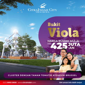 CitraIndah City Jonggol meluncurkan Cluster terbaru tipe real estate Gold yaitu Bukit Viola dilengkapi dengan Taman Tematik ala Atomium Brussel, View Perbukitan, Tanah Luas, dan sudah Siap Huni. Segera miliki unitnya!