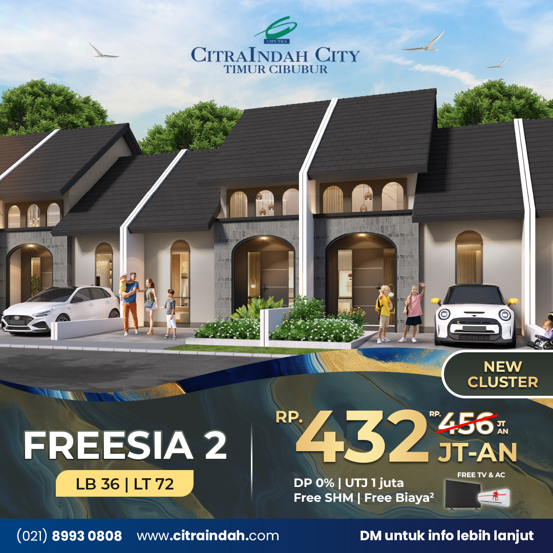 Menghadirkan CLUSTER terbaru, CitraIndah City Jonggol meluncurkan Cluster Freesia dengan tema modern classic yang dilengkapi taman bernuansa Eropa dan HARGA TERJANGKAU! mulai 400 Juta-an, Anda bisa miliki rumah 1 lantai dengan design fasad lebih modern, memiliki privat backyard, dengan carport yang lebih luas, lokasi cluster terdepan dekat fasilitas dan mempermudah mobilitas Anda.